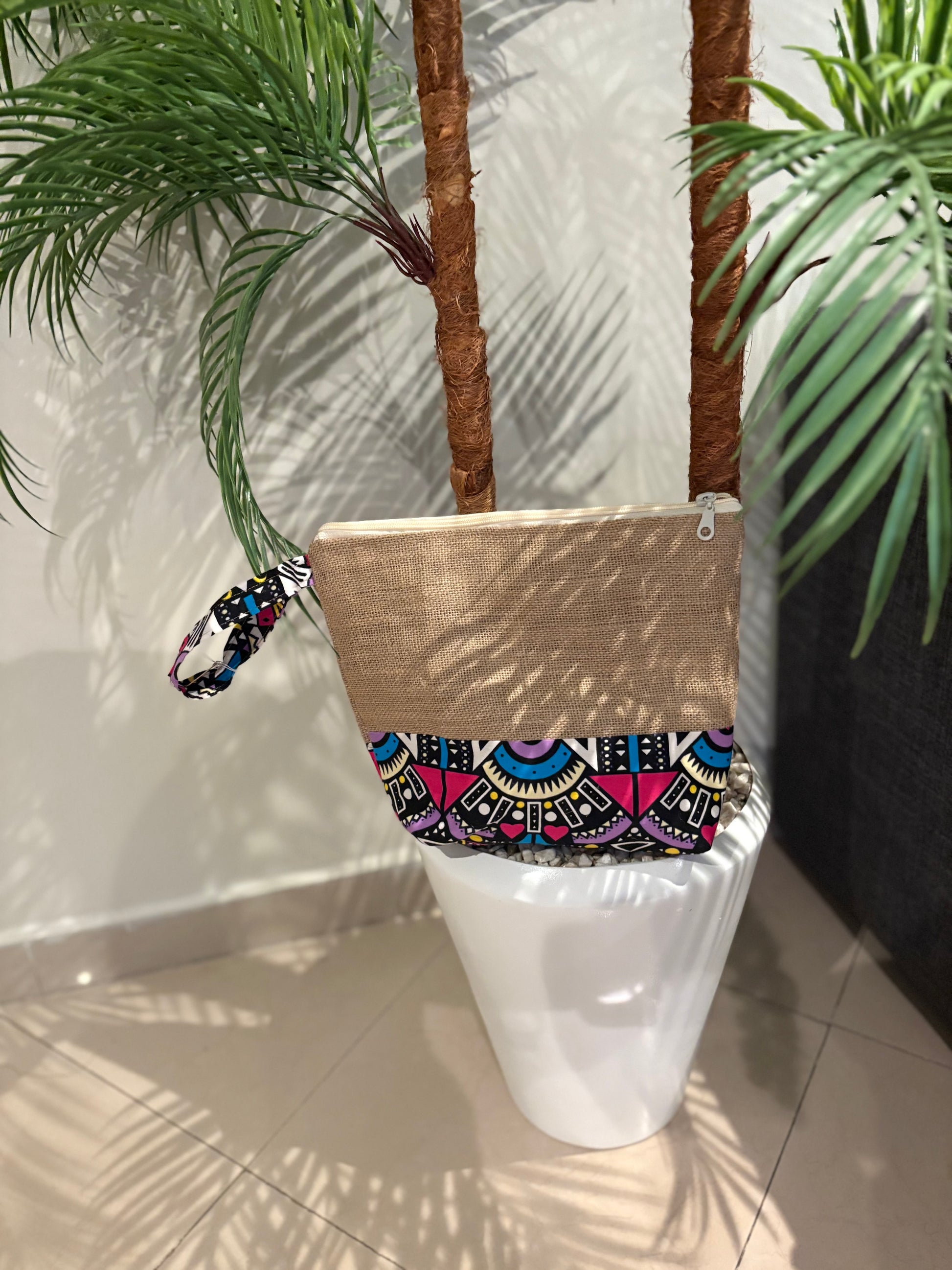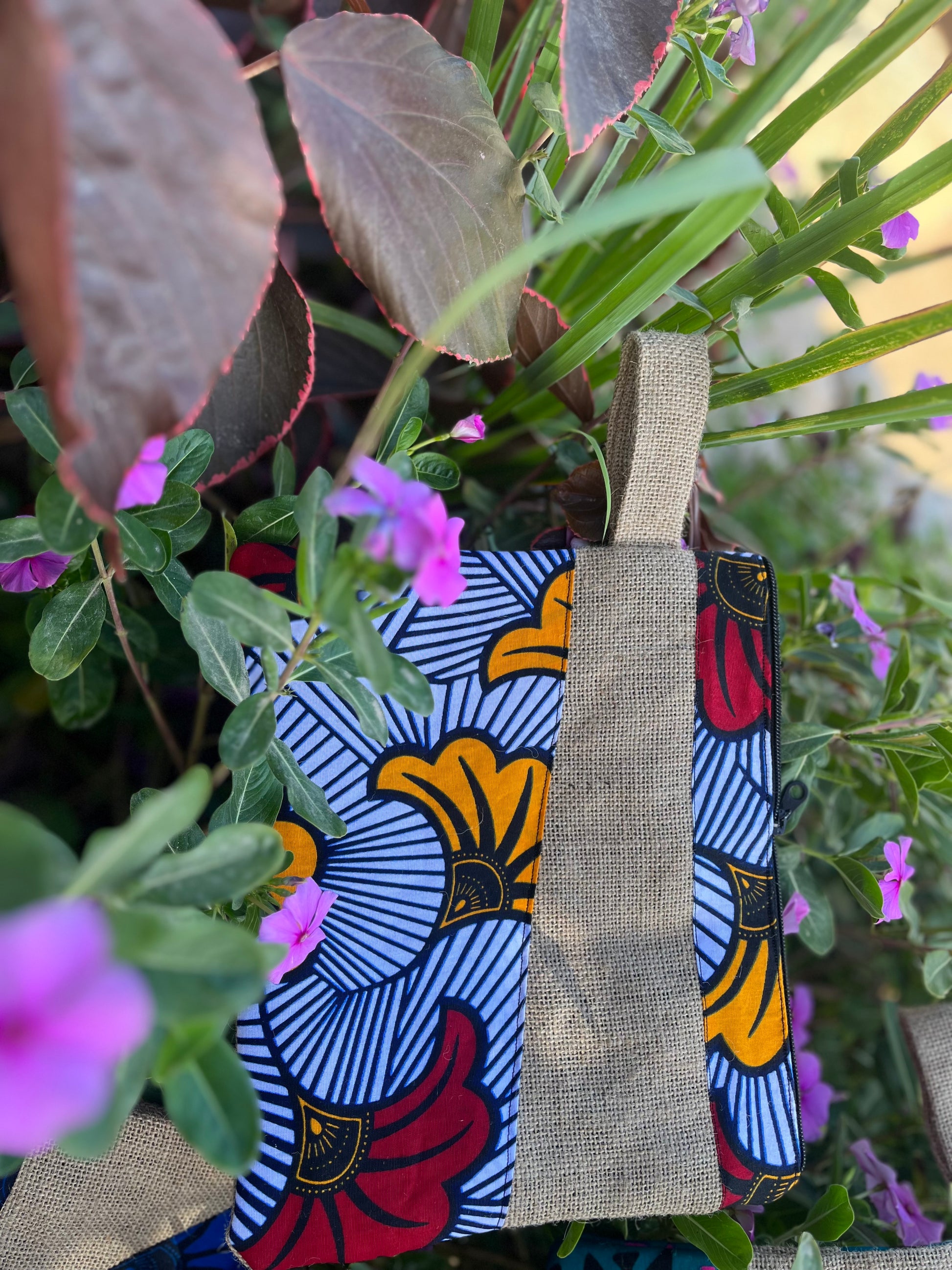 Toile de jute rehaussée d'une touche de pagne africain (wax en coton), disponible en taille 22/28. Un mélange unique pour un style authentique et original !